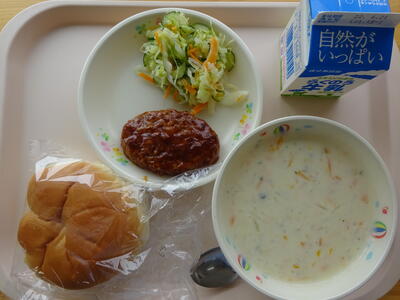 今日の給食は、「チキンカレー、牛乳、ヨーグルト和え」でした。この組み合わせは、子どもたちも先生たちにも、大人気でした!!
