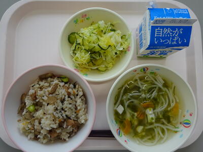 6月最初の給食は、「枝豆ごはん、牛乳、かぼちゃのそぼろ煮、もやしのごま酢和え」でした。