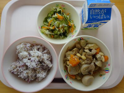 今日の献立は「麦ごはん、牛乳、のっぺい汁、小いわしの梅の香揚げ、ひじきと枝豆のごま酢和え」でした。