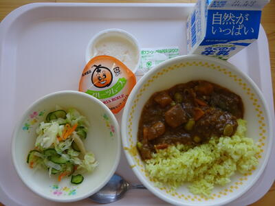 二学期最初の給食は、「夏野菜カレー、五分づけあえ、フルーツムース、牛乳」でした。