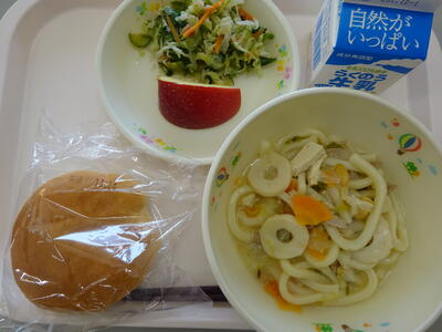 献立は、「米粉パン、牛乳、野菜たっぷりうどん、クルミあえ、りんご」でした。りんごは、秋から冬にかけておいしくなる果物です。りんごには、水溶性の食物繊維が多く、おなかの調子を整える働きがあります。今日のりんごは、シャキシャキとした歯ごたえと甘味のあるりんごでした。