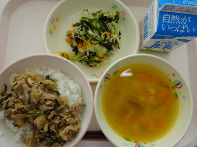 給食は、「ごはん、牛乳、かぼちゃのみそ汁、豚肉のしょうが焼き、わかめの酢のもの」でした。