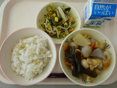 今日の給食は、「麦ごはん、牛乳、煮こみおでん、海藻サラダ」でした。
