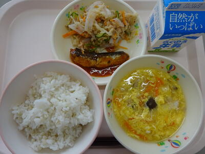 今日の給食は、「麦ごはん、牛乳、酸辣湯(サンラータン、スーラータンと言います。)、いわしのトマト煮、こんにゃくサラダ」でした。