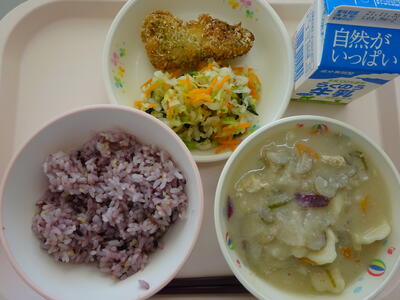 今日の給食は、食育の日「ふるさとくまさんデー」は、「山鹿地方の味」でした。山鹿地方は、栗、お茶、赤米、アスパラガスなどの野菜が栽培されています。