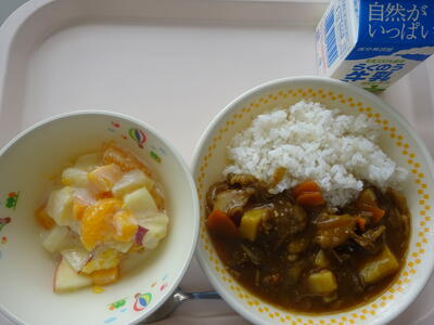 「森のきのこカレー、牛乳、ヨーグルトあえ」でした。森のきのこカレーは、11月定番のカレーです。エリンギ、しめじ、えのきたけのきのこと、さつまいも、りんごを入れて作ります。ピリッと辛いルウとさつまいもの甘味が味わえるカレーでした。