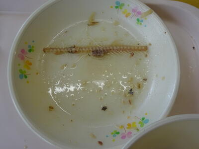 1年生の教室では、さんまの骨を一緒にとりながら給食時間を過ごしました。最初から最後まで自分でさんまの骨を取り、きれいに食べ終わっている子どももいました。(2・3枚目の写真です。)自分でできたことは、自信につながると思います!!