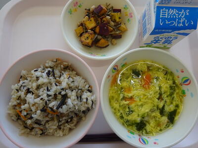 今日の給食は、「ひじき御飯、牛乳、かきたま汁、ミックスかりんとう」でした。昨日の給食の感想に、「明日(11月26日)の給食が楽しみです。」と書いてありました。どの献立を楽しみにしているのかぁと、私もワクワクしていました。