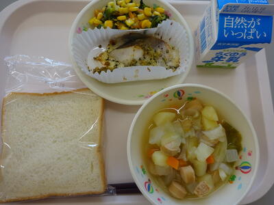 献立は、「食パン、牛乳、ポトフ、魚のハーブパン粉焼き、ほうれん草のソテー」でした。