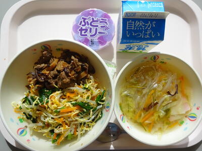 11月最後の給食は、「ビビンパ、牛乳、春雨スープ、ぶどうゼリー」でした。