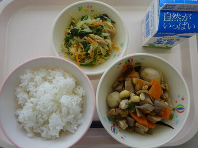 今日の給食は、「ごはん、牛乳、大豆入り筑前煮、青じそドレッシングあえ」でした。早速、「れんこん、ごぼう、にんじん、里いも」の根菜類をたっぷり使った煮物でした。筑前煮は、昆布でだしを取り、煮込んでいきます。今日は、そのだしを取った後の昆布も、小さく切って入れました。気がついたでしょうか?