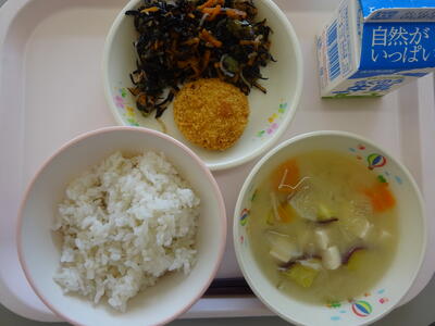 今日の給食は、「麦ごはん、牛乳、さつまいものみそ汁、キャベツのミンチカツ、ひじきの炒り煮」でした。さつまいものみそ汁には、かくし味に豆乳を加えました。さつまいもの甘みと豆乳で、いつもより甘く感じました。