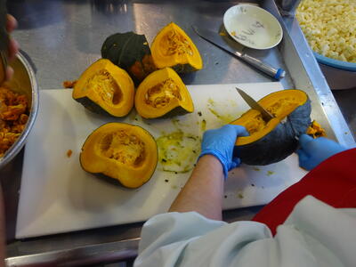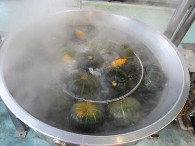 今日のシチューのかぼちゃは、26㎏使いました。こんなにもたくさんの量のかぼちゃを、調理員さんは一体どうやって切っているのでしょうか?
