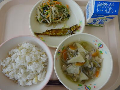 給食は、「麦ごはん、牛乳、せんべい汁、ししゃものカレー焼き、もやしのごま酢和え」でした。