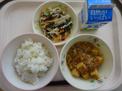 今日の給食は「麦ごはん、牛乳、マーボー豆腐、ビーフンサラダ」でした。マーボー豆腐は、中学3年生のリクエストメニューで多かった献立です。私も家で作っても、給食のような味にはなりません。