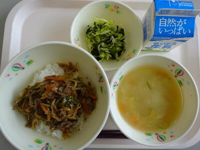 今日の給食は、「あか牛の焼き肉丼、牛乳、じゃがいものみそ汁、酢の物」でした。そして、お米は、「白水っ米」です。給食の配膳中から、焼き肉丼のいい香りが教室中に広がっていました。白水っ米と、あか牛のスペシャル焼き肉丼を、みんなしっかり味わいながらいただきました。