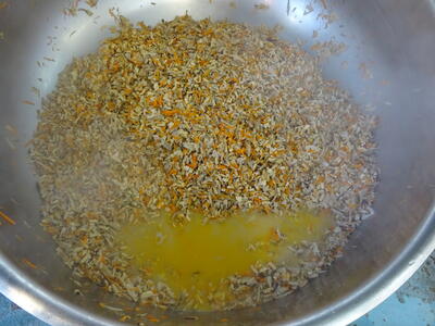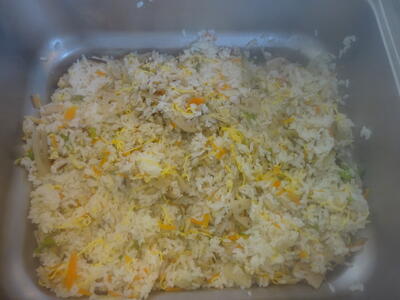 大豆のいそ煮は、『とり肉、人参、大豆、れんこん、ごぼう、こんにゃく、生揚げ、ひじき、いんげんまめ』で作りました。もう少し味がしっかりついた方が良かったかなぁと思いました。しかし、御飯には『カレーじゃこふりかけ』があるので、優しい味に仕上げました。