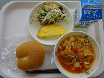今日の給食は、「米粉パン、ミネストローネ、プレーンオムレツ、切り干し大根のサラダ」です。