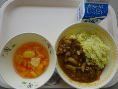 今日の給食は、「麦ごはん、あか牛のカレー、牛乳、フルーツミックス」です。先週金曜日の給食の放送で、お知らせをしていたので、今日のメニューを楽しみにしていた子どもたちも多かったようです。