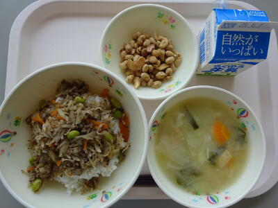 今日の給食は、「シャキシャキそぼろ丼、牛乳、キャベツのみそ汁、りんかけ豆」でした。