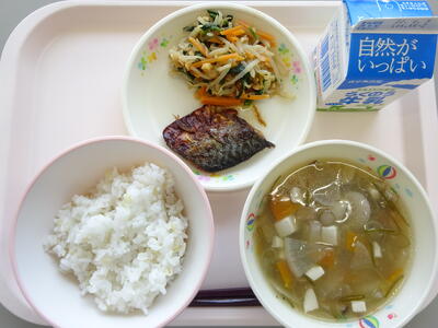 今日の給食は、「麦ごはん、牛乳、のっぺい汁、さばのソース煮、ピーナツ和え」でした。給食で大切にしている一つの『一汁二菜』の和食給食です。和食給食は、学年が上がるにつれてしっかり食べることができるようです。