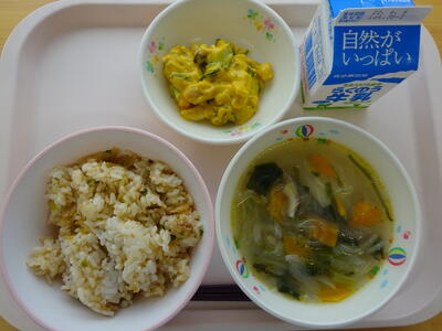 今日の給食は、「キムタクごはん、牛乳、春雨スープ、カラフルかぼちゃのサラダ」でした。