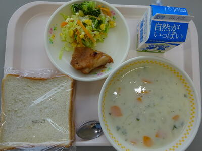 今日の給食は、「食パン、牛乳、クリームスープ、鶏肉のマーマレード焼き、ブロッコリーサラダ」でした。