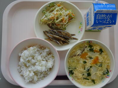 今日の給食は、「麦ごはん、牛乳、にらたま汁、きびなごのから揚げ、かみんこサラダ」でした。