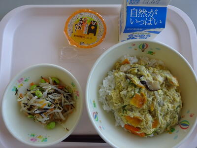 今日は、「おやこどんぶり、牛乳、ひじきと枝豆のごま酢和え、みかんゼリー」でした。親子どんぶりは、かつお節と昆布で出汁をとり作りました。今日は味のアクセントに、「ごぼう」をささがきしていれました。ごぼうの風味と食感がプラスされておいしさが増していました。昨日の給食時間とは違い・・・おかわりをする人が多かったです。