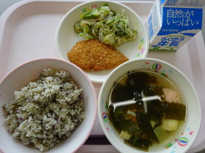 今日は食育の日で、「ふるさとくまさんデー」の給食でした。『水俣・芦北地方』の味で、「茶飯、牛乳、つみれのすまし汁、かつおフライ、サラ玉サラダ」です。