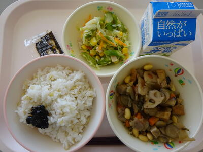 今日の給食は、「麦ごはん、牛乳、大豆の五目に、アスパラサラダ、ひじきの佃煮」でした。低学年の子どもたちは、ひじきのり佃煮に興味津々でした。
