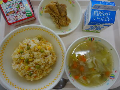 今日の献立は、「コーンピラフ、牛乳、野菜スープ、フライドチキン、クリスマスチョコケーキ」でした。