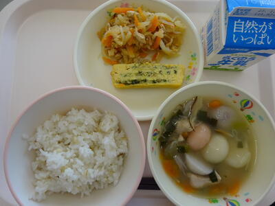 今日の給食は、「麦ごはん、牛乳、お雑煮、千草焼き、煮なます」でした。久しぶりの給食は、野菜をたくさん使った給食を作りました。子どもたちは、しっかり食べることができました。