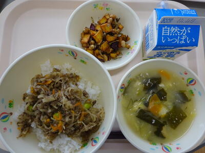 今日の給食は、「ごはん(おあしす米)、牛乳、大豆の五目煮、ゆかり和え」でした。