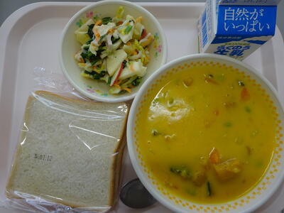 今日の給食は、「食パン、牛乳、かぼちゃシチュー、白菜とりんごのサラダ」でした。