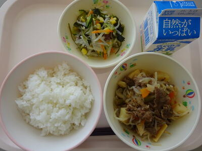 今日の給食は、「御飯(おあしす米)、牛乳、あか牛の肉じゃが、海藻サラダ」でした。