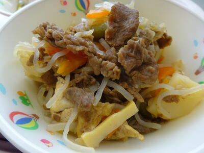今日の肉じゃがは、あか牛のおいしさを引き出すために、いつもの肉じゃがより玉ねぎ、生姜を多めに入れました。また、あか牛を炒める時に調味料を入れて、お肉に味がしっかりつくように作りました。ホクホクのじゃがいも、シャキシャキのたけのこなど、それぞれの具にもあか牛のうまみがしみこんでいました。