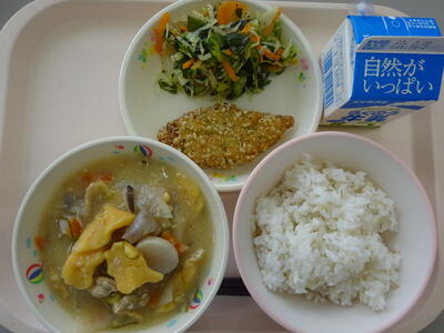 今日の給食は、「麦ごはん、牛乳、八宝菜、ししゃもフライ、ひじきの炒り煮」でした。