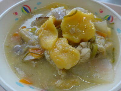 今日の団子汁は、冷凍の人参ペーストを入れた団子でした。淡いオレンジ色の団子は、他の具との相性も良く、もちもちしておいしかったです。給食センターでは、こねた団子をしばらく冷蔵庫で寝かしてから、茹でて水冷した後に汁の中に入れていきます。そうすることで、食べる頃には、お汁全体にちょうどいいとろみが出てきます。このとろみのある団子汁が、ホッとするおいしさです。