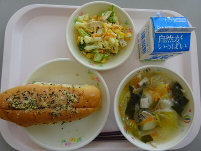 今日の給食は、「チーズパセリトーズと、牛乳、ラビオリ入りスープ、カリフラワーサラダ」でした。
