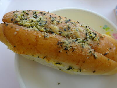 チーズパセリトーズとは、12月の給食に出すことができなかった手作りパンです。切れ目の入ったコッペパンに、無塩バター、オリーブオイル、ガーリックパウダーを混ぜたものを塗りました。その後、乾燥パセリとバジル、粉チーズを合わせたものをふりかけて、オーブンで焼きました。200℃10分くらいで、こんがりと焼き上がりました。ガーリックの風味が、教室中に漂っていました。