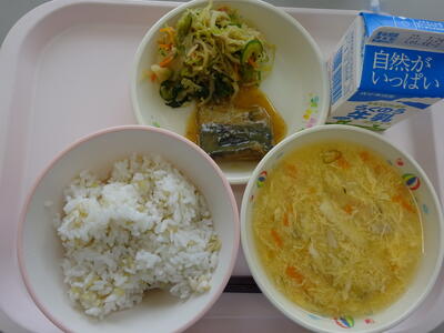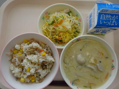 今日の給食は、「れんコーン御飯、牛乳、ご汁、バンサンスー」でした。
