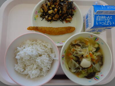 今日の給食は、「麦ごはん、牛乳、キャロット団子汁、ホキの天玉揚げ、ゆかり和え」でした。