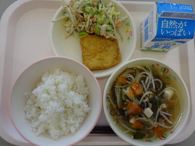 今日の給食は、「御飯(おあしす米)、牛乳、魚そうめん汁、肉づめいなり、ごぼうサラダ」でした。