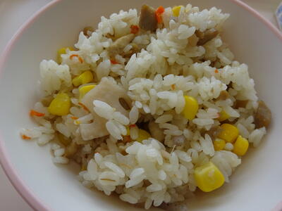 今日の混ぜ御飯は、味をつけた具をお米と一緒に炊き込みました。コーンは別に加熱し、炊き上がった御飯に入れて混ぜ込みました。いつもより水加減も減らしたので、チャーハンに近い仕上がりになりました。