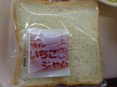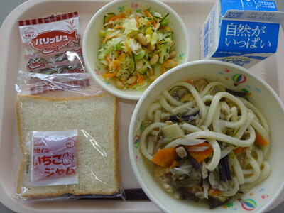今日の給食は、「食パン、いちごジャム、牛乳、山菜うどん、まめまめサラダ、一食いりこ」でした。