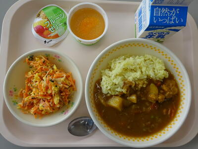 今日の給食は、「チキンカレーライス、牛乳、カロテンサラダ、フルーツゼリー」でした。