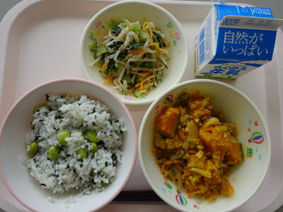 6月最初の給食は、「枝豆ごはん、牛乳、かぼちゃのそぼろ煮、もやしのごま酢和え」でした。
