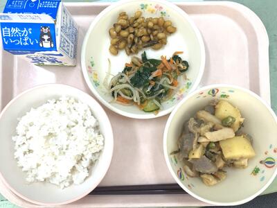 主菜、副菜は給食。主食は自分たちで収穫したお米を文化鍋で炊いたごはん。みそ汁は各班でオリジナル。こちらは、おうちの手作りみそがポイントのおいしいみそ汁でした♪