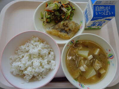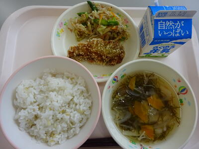 今日の給食は、「麦ごはん、牛乳、もずくのすまし汁、ホキの天玉揚げ、アスパラのおかか和え」でした。